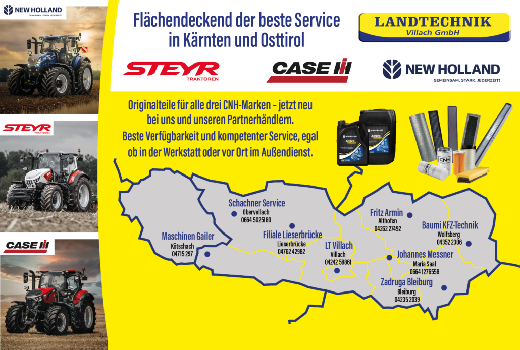 Profitieren Sie auch vom flächendeckend besten Service in Kärnten und Osttirol mit Originalteilen für alle drei CNH Marken (New Holland, Case IH und Steyr) mit bester Verfügbarkeit und kompetenten Service, egal ob in der Werkstatt oder vor Ort im Außendienst. Jetzt bei uns und unseren Partnerhändlern!